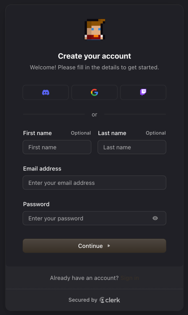 We use Clerk for signups. It is very secure, you have complete control of your information (you can delete it anytime) and we will never spam you. You can create an account using Discord, Google, Itch.io, or directly through Clerk.